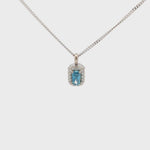 Deep blue radiant cut sustainable diamond in a very special pendant with infinity detailing, adorned with white melee diamonds.